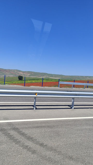 At 7.30 our marshrutka leaves for Bishkek. It is just us, a Japanese tourist and a group of babushkas. One golden teethed lady hands us a sheet of dried apple leather to try. By now we are used to sharing the road with all types of livestock on their way to the summer pastures. The green hills are colored yellow, orange and purple with the first flowers. We stop for lunch at a roadside trout restaurant with tapchans.